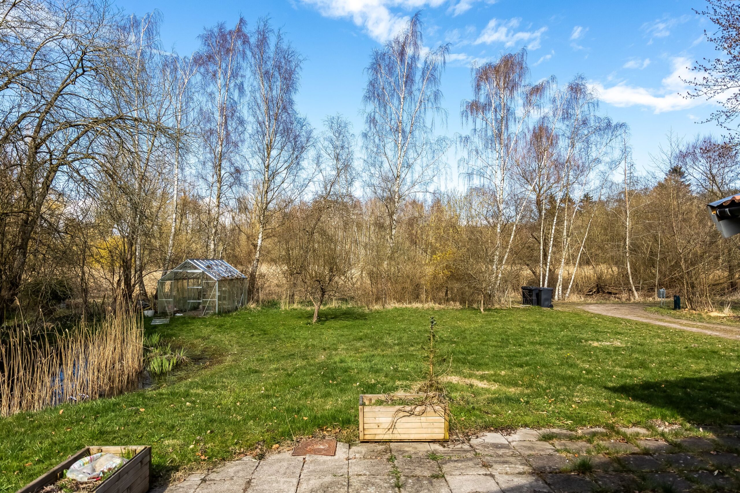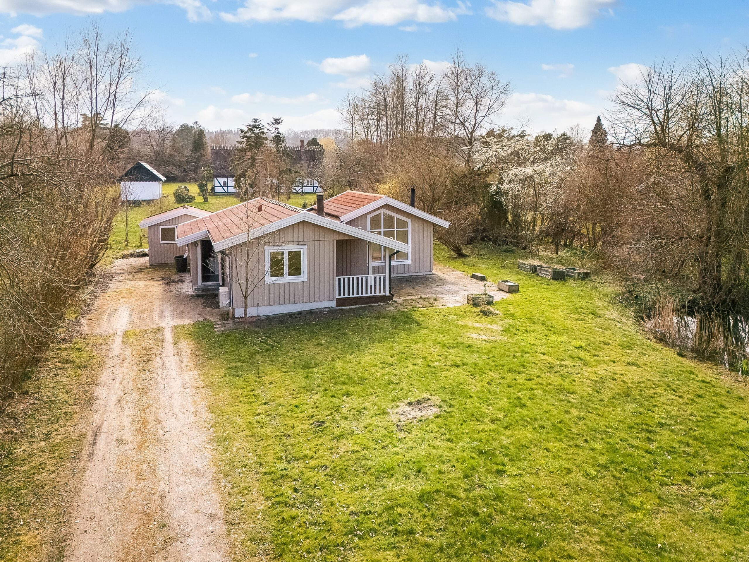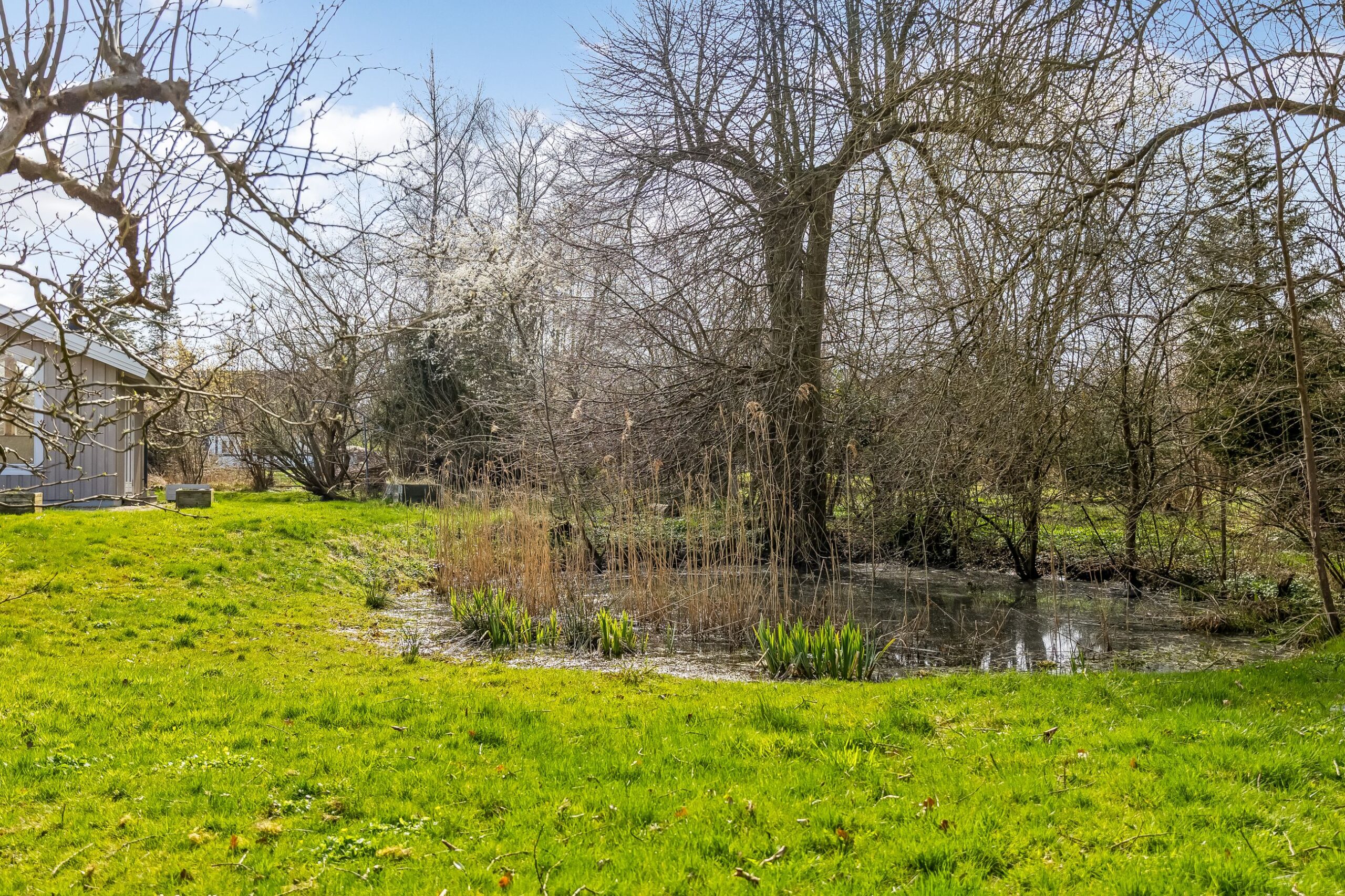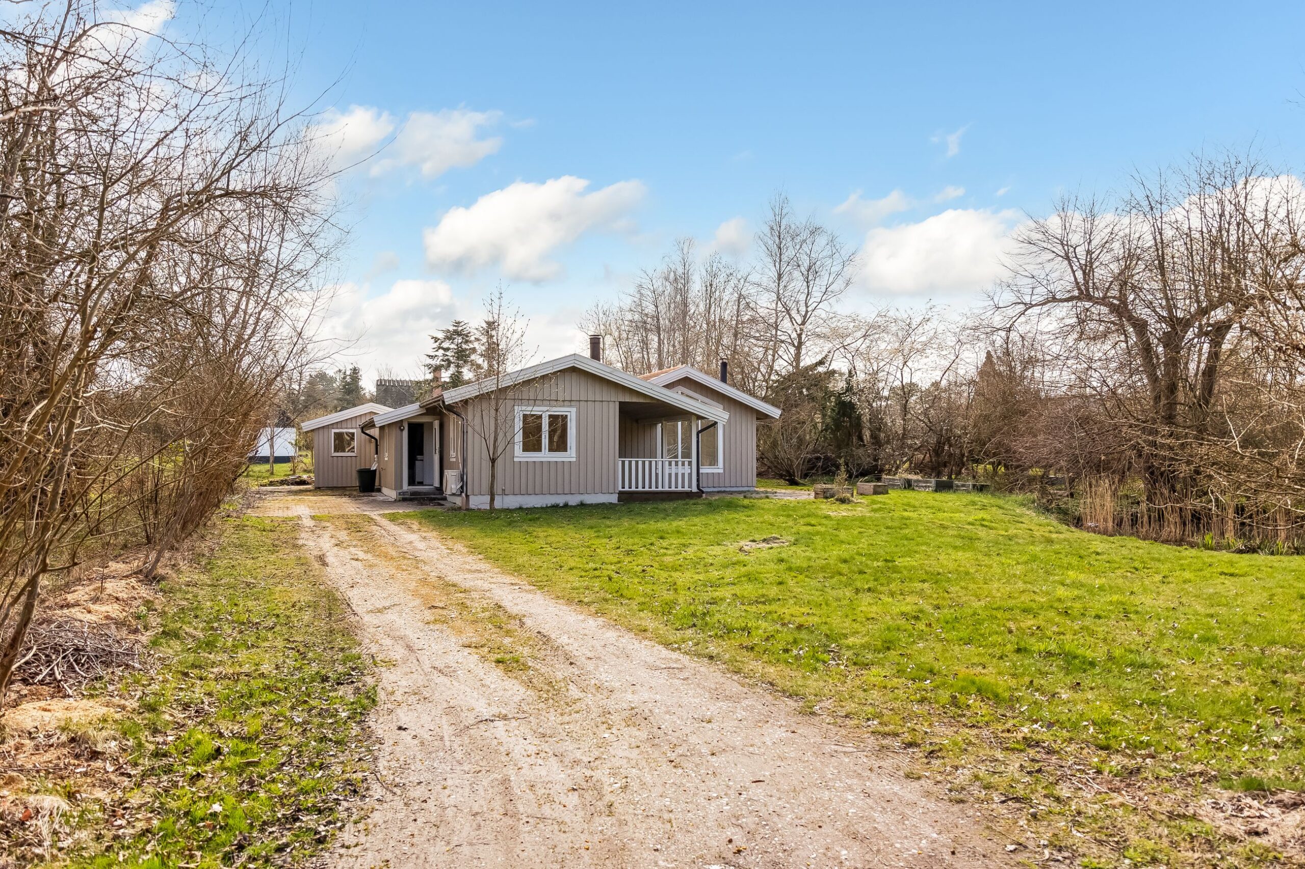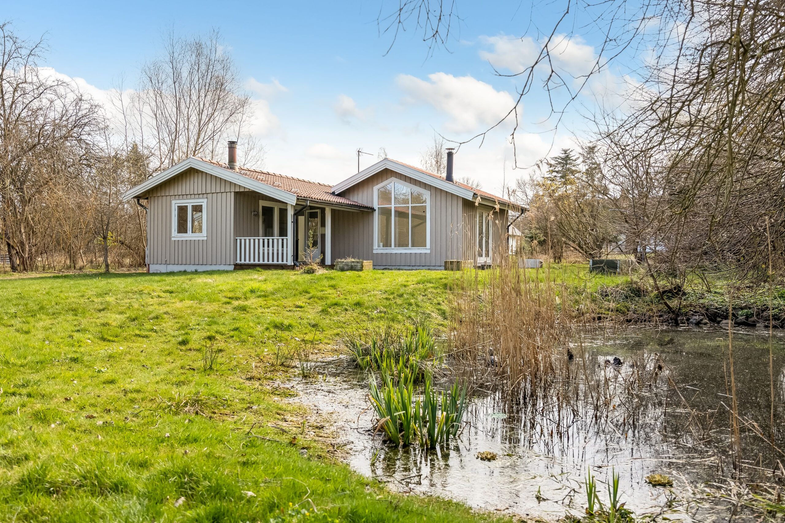 Her får du 80 veludnyttede m² bolig opført i 1989, beliggende i fuldstændig fredelige omgivelser med egen sø og direkte op til skovens grønne arealer. Kombinationen af vand, skov og privat atmosfære skaber en sjælden ro, hvor naturen føles som en integreret del af ejendommen.