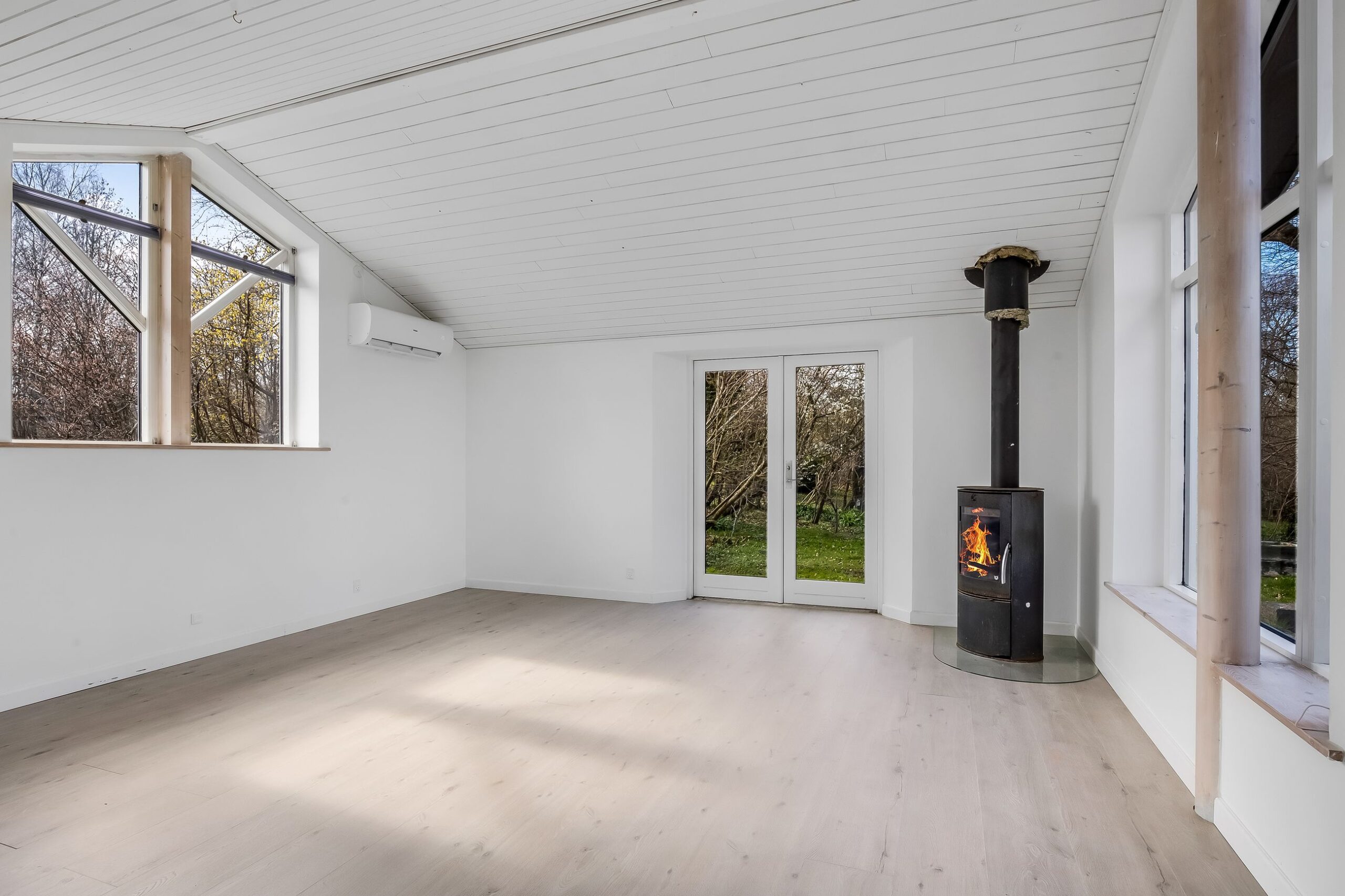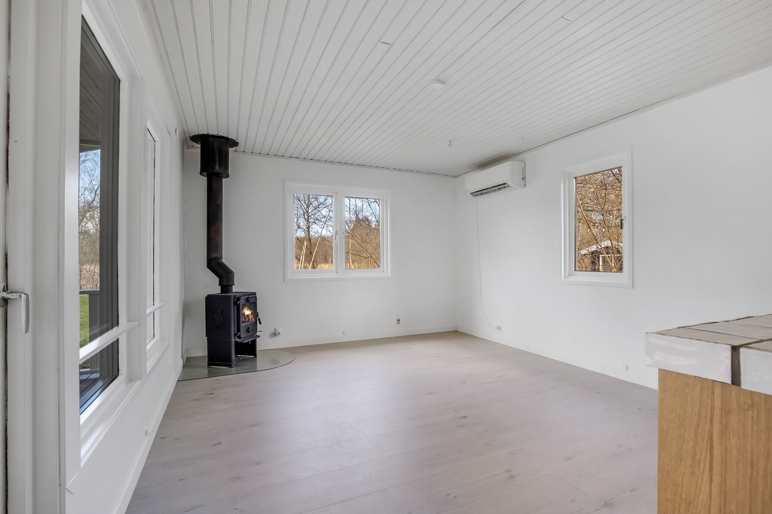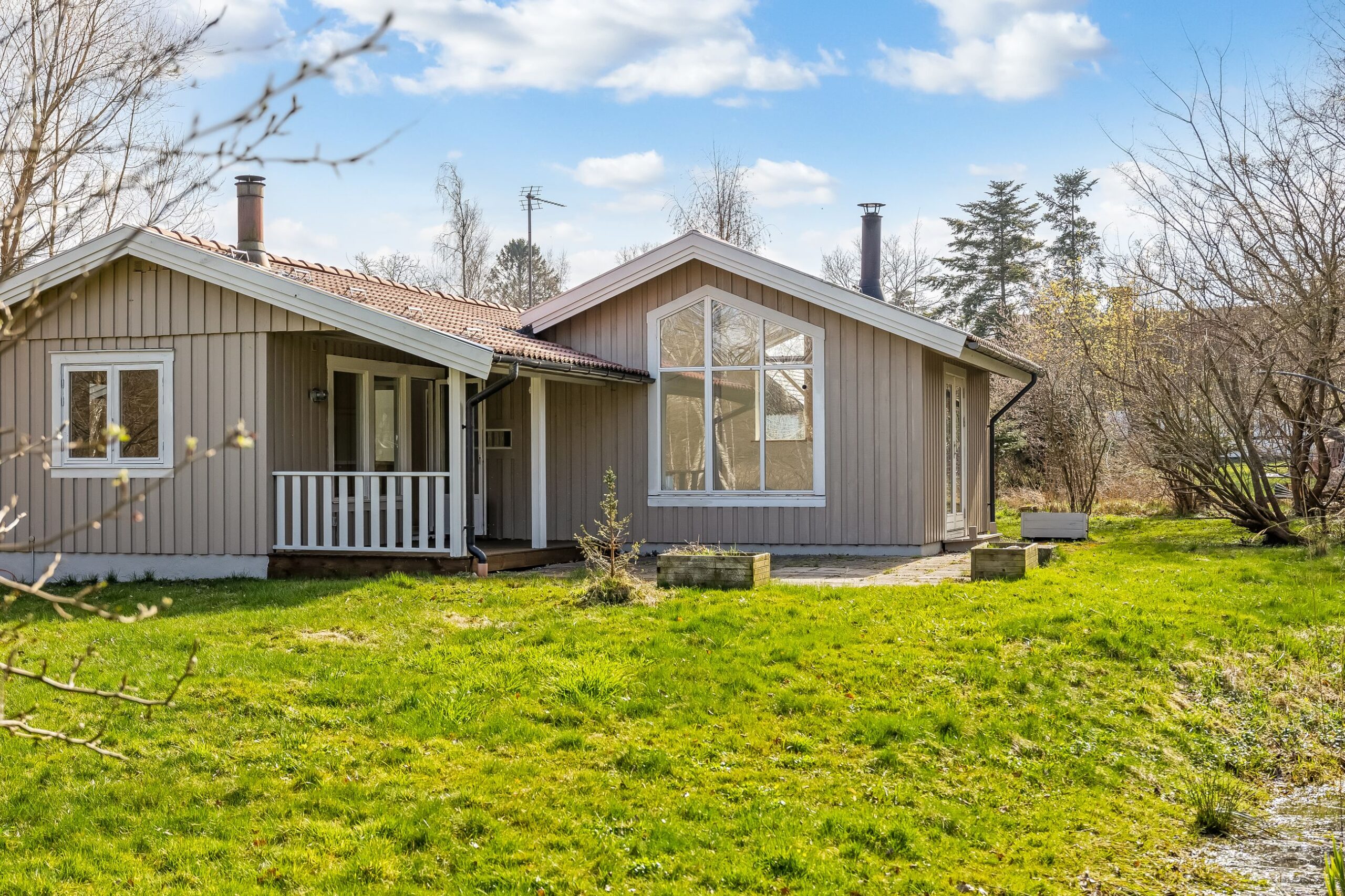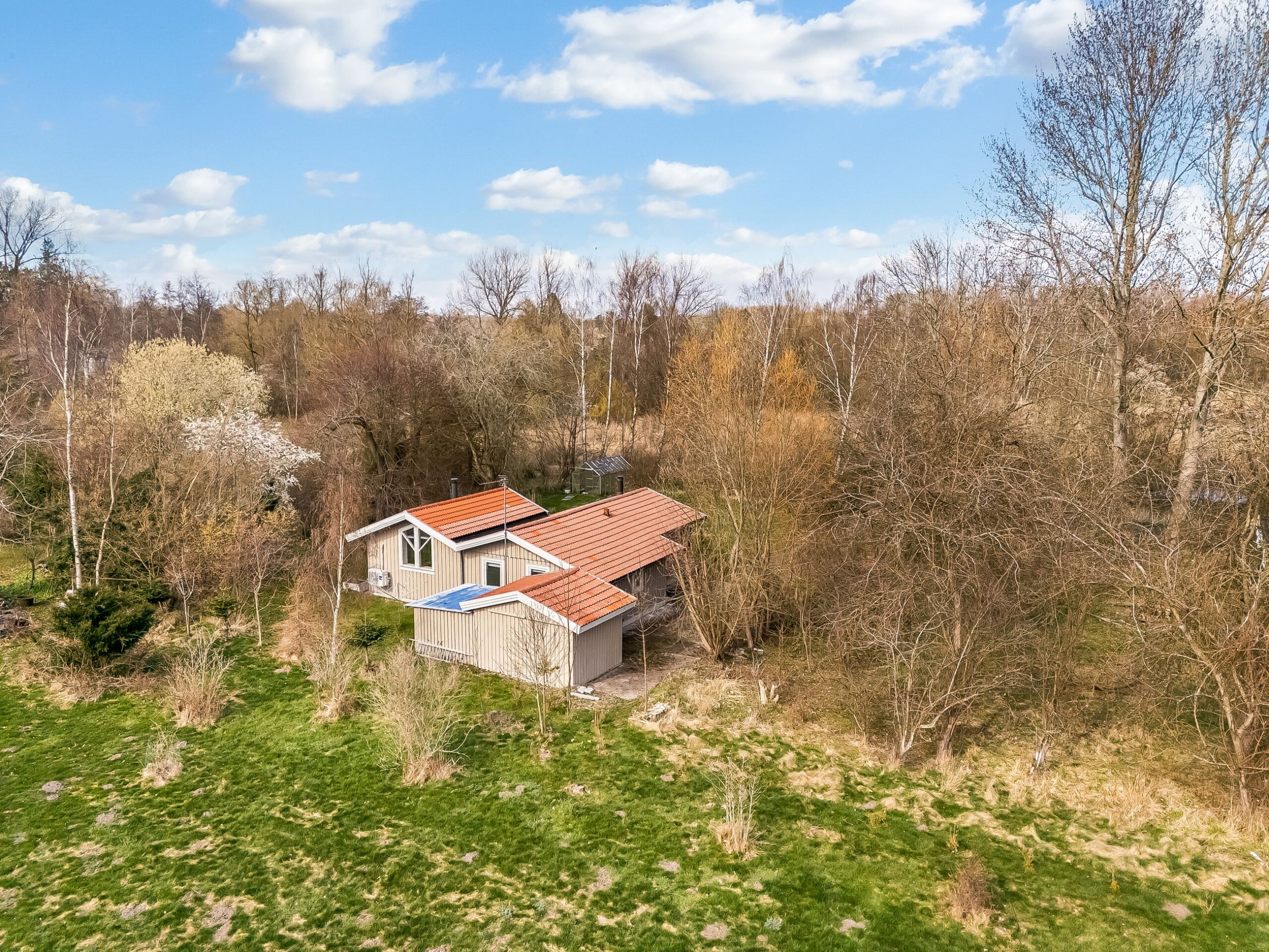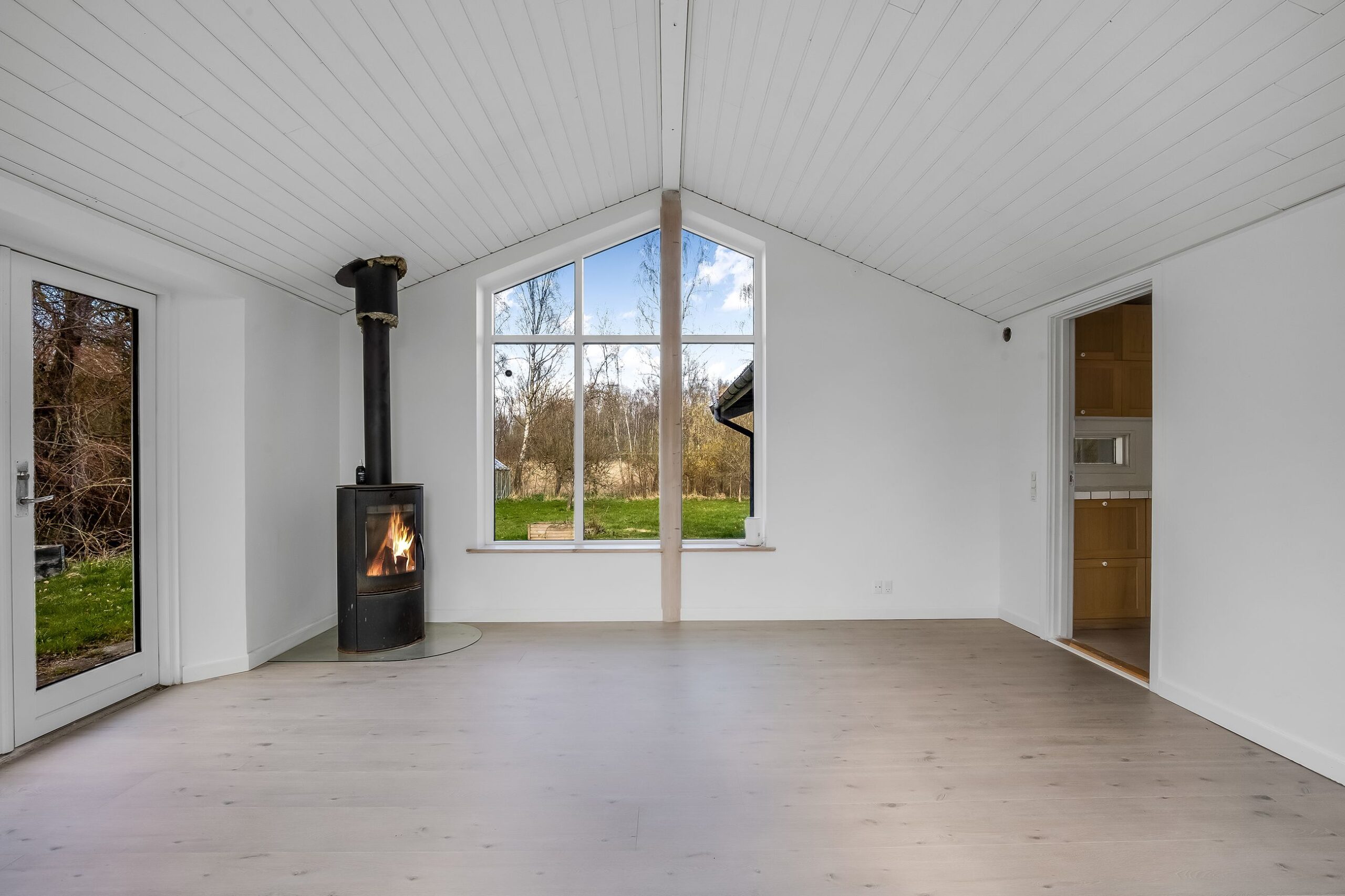 Her får du 80 veludnyttede m² bolig opført i 1989, beliggende i fuldstændig fredelige omgivelser med egen sø og direkte op til skovens grønne arealer. Kombinationen af vand, skov og privat atmosfære skaber en sjælden ro, hvor naturen føles som en integreret del af ejendommen.
