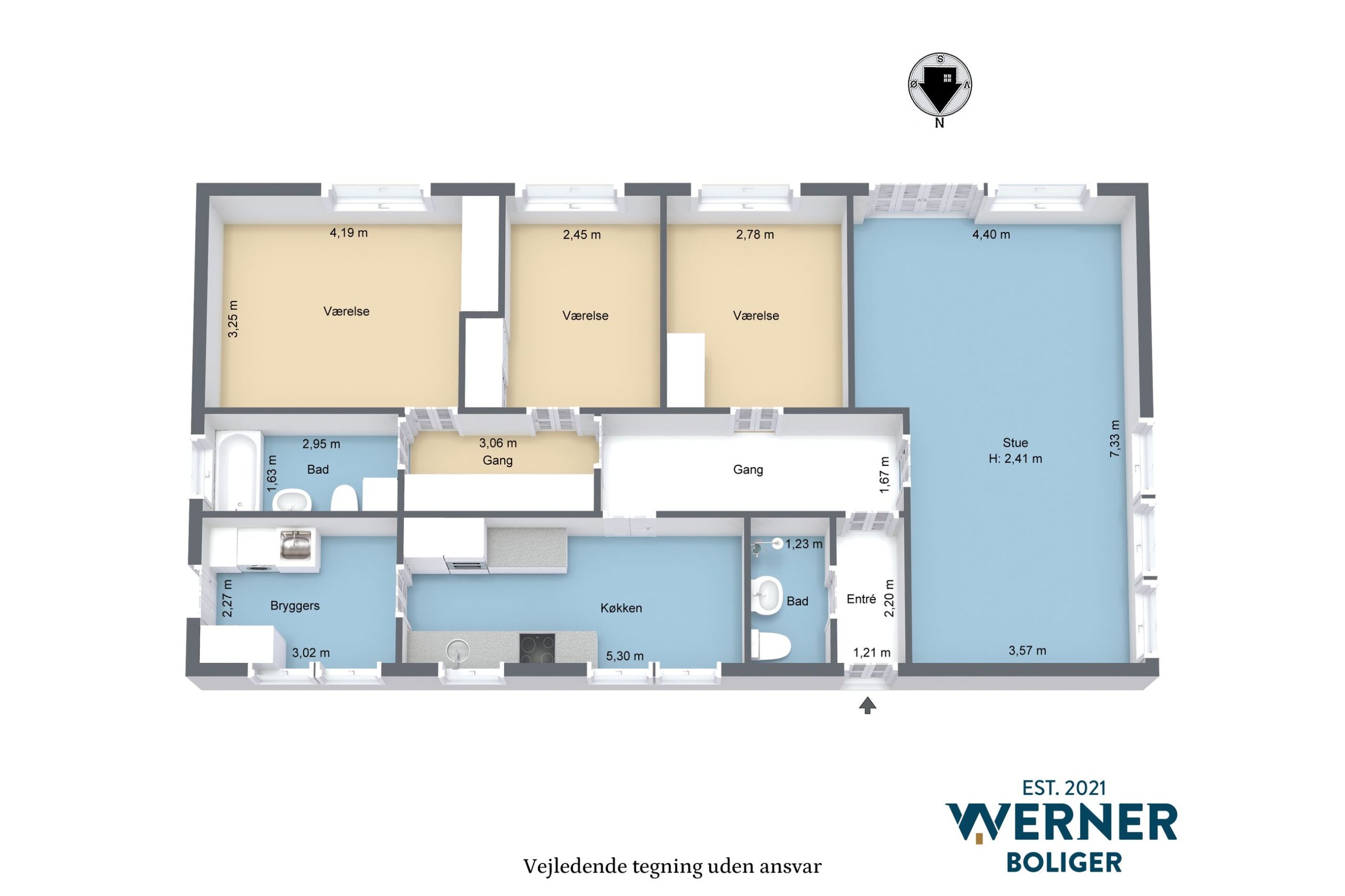 Planløsningen er gennemtænkt, så samvær og hverdagsliv naturligt flettes sammen. De separate værelser giver plads til både børn, gæster og hjemmekontor.